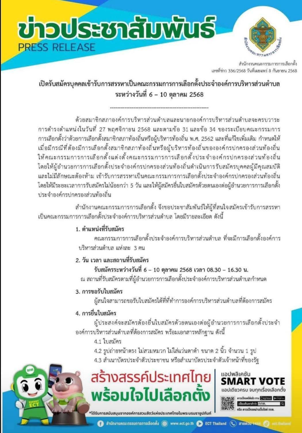 การสมัครเข้ารับการสรรหาเป็นคณะกรรมการการเลือกตั้งประจำองค์การบริหารส่วนตำบล ระหว่างวันที่ 6-10 ตุลาคม 2568