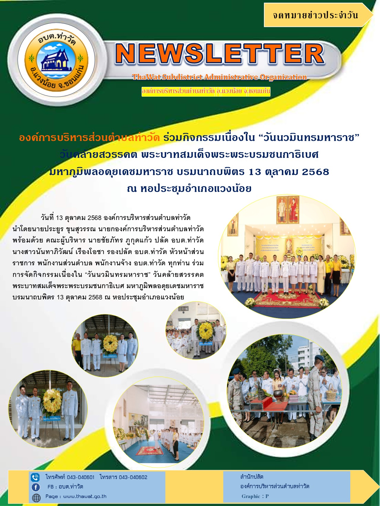 วันที่ 13 ตุลาคม 2568 องค์การบริหารส่วนตำบลท่าวัด นำโดยนายประยูร ขุนสุวรรณ นายกองค์การบริหารส่วนตำบลท่าวัด พร้อมด้วย คณะผู้บริหาร นายชัยภัทร ภูกุดแก้ว ปลัด อบต.ท่าวัด นางสาวนันทาภิวัฒน์ เรืองโอชา รองปลัด อบต.ท่าวัด หัวหน้าส่วนราชการ พนักงานส่วนตำบล พนักงานจ้าง อบต.ท่าวัด ทุกท่าน ร่วมการจัดกิจกรรมเนื่องใน “วันนวมินทรมหาราช” วันคล้ายสวรรคต พระบาทสมเด็จพระพระบรมชนกาธิเบศ มหาภูมิพลอดุยเดชมหาราช บรมนาถบพิตร 13 ตุลาคม 2568 ณ หอประชุมอำเภอแวงน้อย