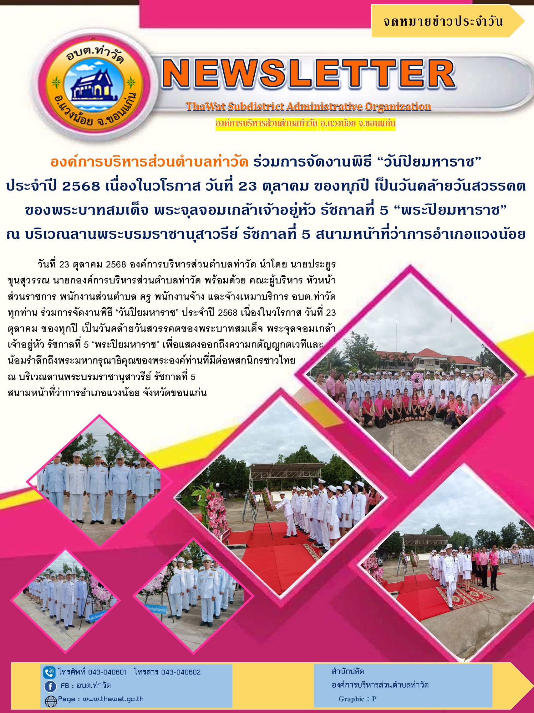 วันที่ 23 ตุลาคม 2568 องค์การบริหารส่วนตำบลท่าวัด นำโดย นายประยูร ขุนสุวรรณ นายกองค์การบริหารส่วนตำบลท่าวัด พร้อมด้วย คณะผู้บริหาร หัวหน้าส่วนราชการ พนักงานส่วนตำบล ครู พนักงานจ้าง และจ้างเหมาบริการ อบต.ท่าวัด ทุกท่าน ร่วมการจัดงานพิธี “วันปิยมหาราช” ประจำปี 2568 เนื่องในวโรกาส วันที่ 23 ตุลาคม ของทุกปี เป็นวันคล้ายวันสวรรคตของพระบาทสมเด็จ พระจุลจอมเกล้าเจ้าอยู่หัว รัชกาลที่ 5 “พระปิยมหาราช” เพื่อแสดงออกถึงความกตัญญูกตเวที และน้อมรำลึกถึงพระมหากรุณาธิคุณของพระองค์ท่านที่มีต่อพสกนิกรชาวไทย ณ บริเวณลานพระบรมราชานุสาวรีย์ รัชกาลที่ 5 สนามหน้าที่ว่าการอำเภอแวงน้อย จังหวัดขอนแก่น